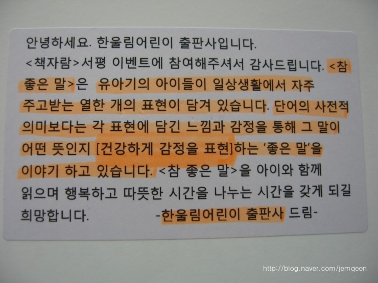 참 좋은 말은 단어의 사전적 의미가 아닌 느낌과 감정을 통해 말의 뜻을 표현해주는 책이라고 한울림어린이 출판사에서 소개한 글입니다