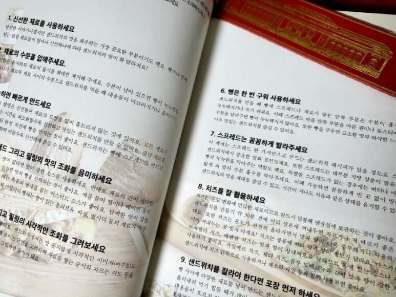 샌드위치의 기본 요소로 /소스와 스프레드, 빵/ 치즈/ 의 종류와 특성을 잘 설명해준다. 평범한 식빵을 어떤 소스와 스프레드로 풍미를 살리느냐에 따라 확연히 개성있는 샌드위치로 변신한다. 바질페스토, 큐컴버 크림치즈, 메이플 월넛 크림치즈, 어니언 크림치즈, 차이브 크림치즈, 캐롯 베지 크림치즈,말린 토마토 스프레드, 부추 케이퍼 스프레드, 베샤멜 소스, 스팸 스프레드 등 결국 소스와 스프레드는 들어가는 재료만 다를 뿐 만드는 과정은 거의 동일하다. 만드는 방법이 제공되어 있으니 쉽게 따라 해 볼 수 있다. 막상 직접 만들어보기까지는 뭔가 어렵고 복잡할 것만 같던 두려움이 다 사라지는 샌드위치 레시피 책이다.