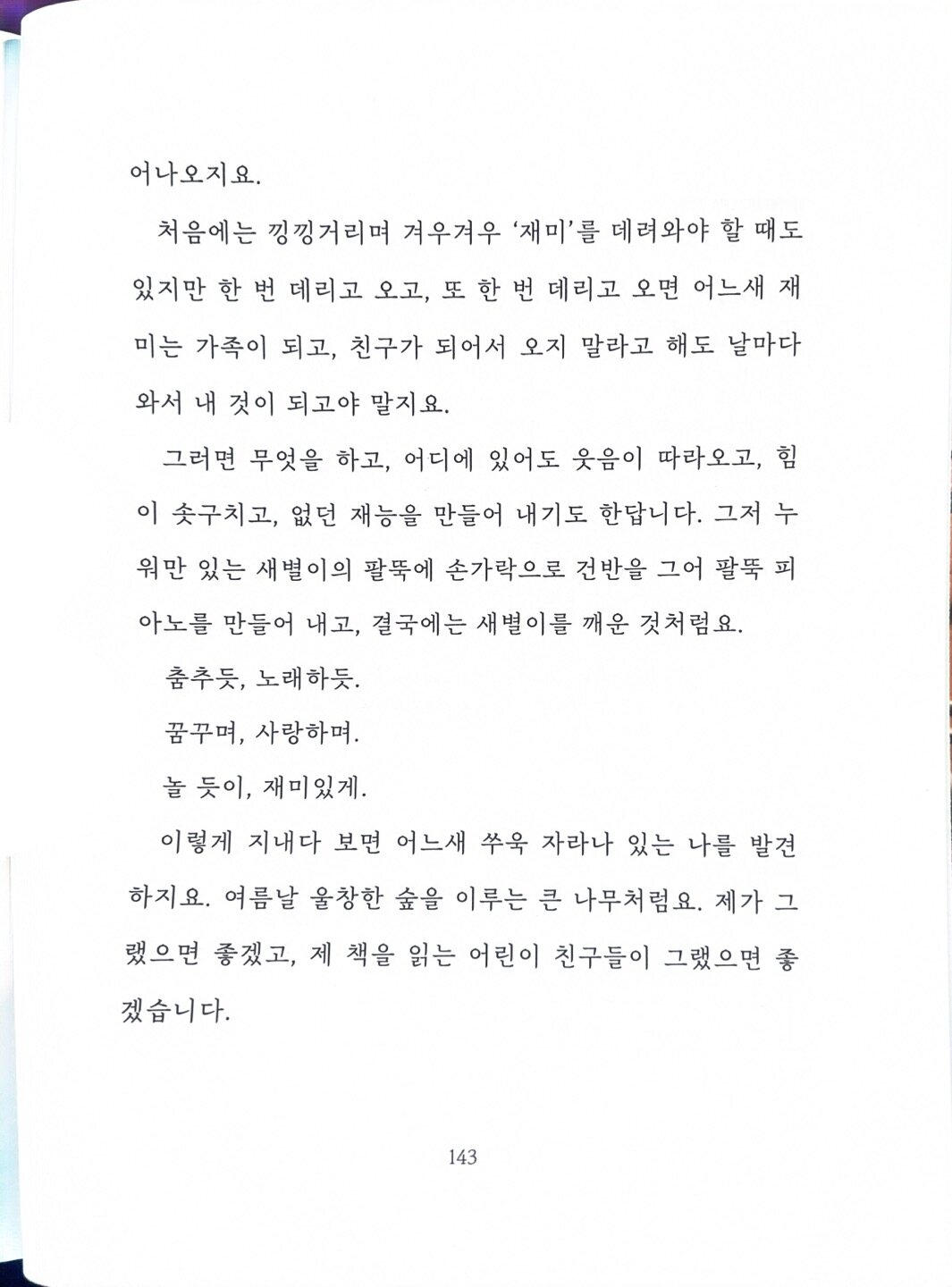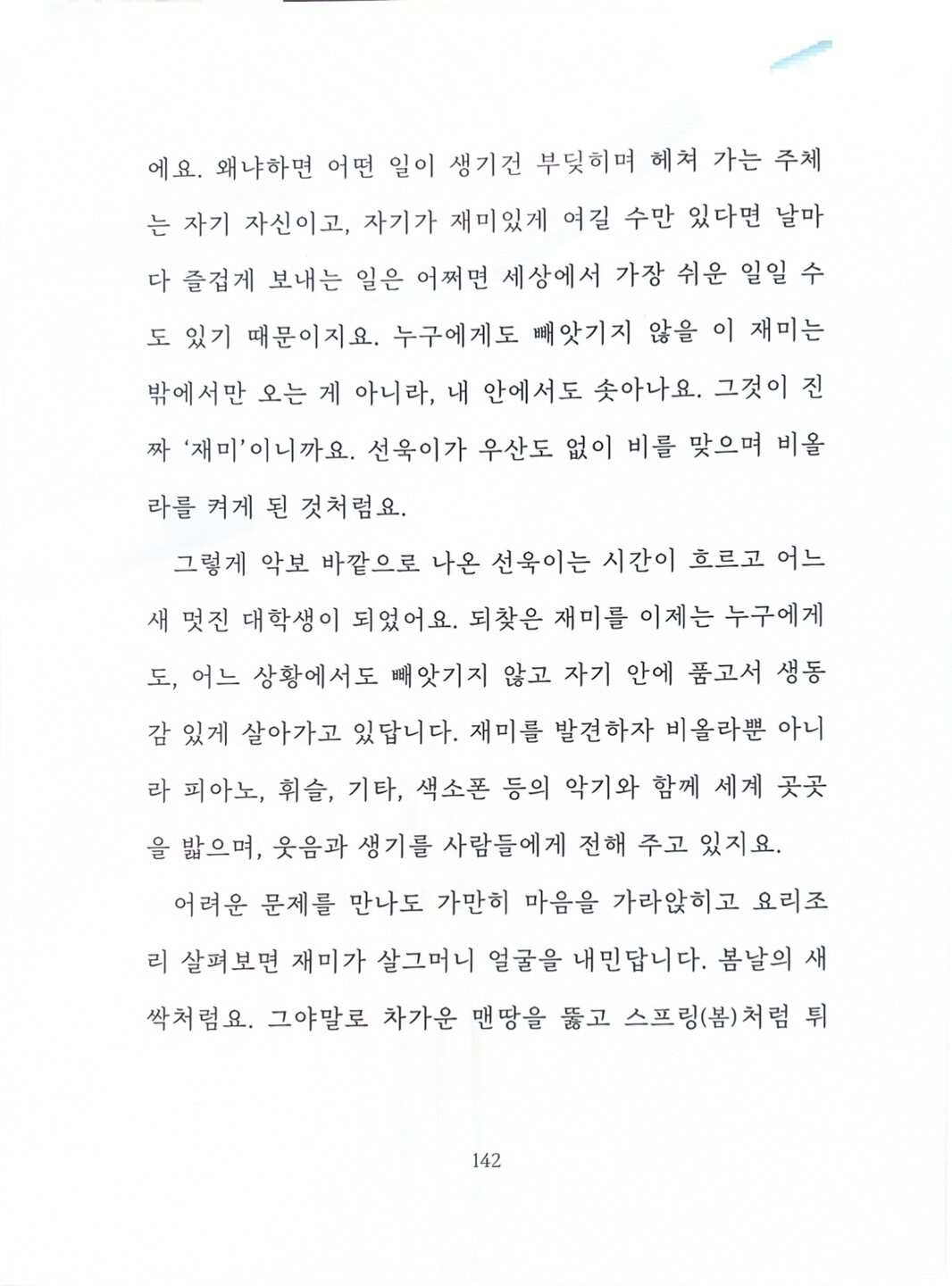 선옥은 깨달음을 얻는다. 결국 조화로운 것이 최고의 연주라는 사실을. 세상을 살아가면서 마냥 행복하다고 이야기할 순 없다. 그러나 조금만 시선을 돌려보면, 이 동화의 할머니 할아버지처럼 서로 조화를 이루면 안 행복할 것은 없다. 내 것, 네 것 할 것 없이 모두가 조화를 이루고 부족해도 그 부족함을 채운다면 모두가 행복할 수 있다는 사실을 이 동화는 우리에게 말해준다. 이런 의미에서 마음이 따뜻해지는 동화였다. 모두가 치열하게 경쟁하지만, 반대로 모두가 조화롭게 사는 방법을 생각한다면 모두가 행복할 수 있을텐데라는 생각을 하게 되었다.