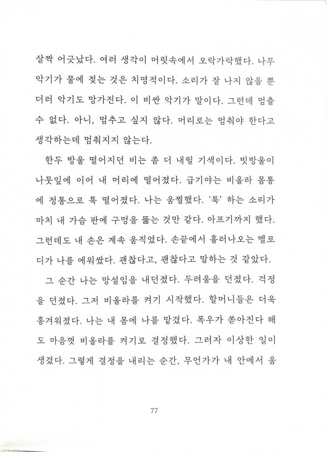 모든 악기가 그렇듯이 비올라도 비를 맞으면 안 된다. 할머니들이 공연을 준비한 광복절 행사에 선욱은 끌리듯이 참석을 하게 되고, 광복절 행사에 비가 내리기 시작한다.
