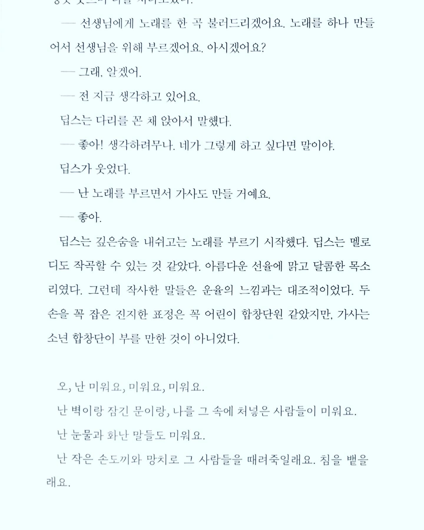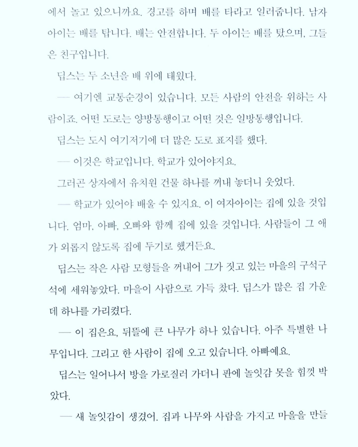 이 책을 보면서 느낀 것은 세상에 대해 문을 닫은 아이가 자기만의 세계에 갇혀 지내던 아이가 놀이치료를 통해 자기 자신을 새롭게 발견하고, 마음에 문을 열어 새로운 세상을 만나는 이야기였다. 주인공 딥스를 처음에는 자폐아로 바라봤다. 그러다 내용을 읽다보니 자폐아가 아니라 세상과 만나는 법을 배우지 못한 아이라는 생각을 하게 되었다.