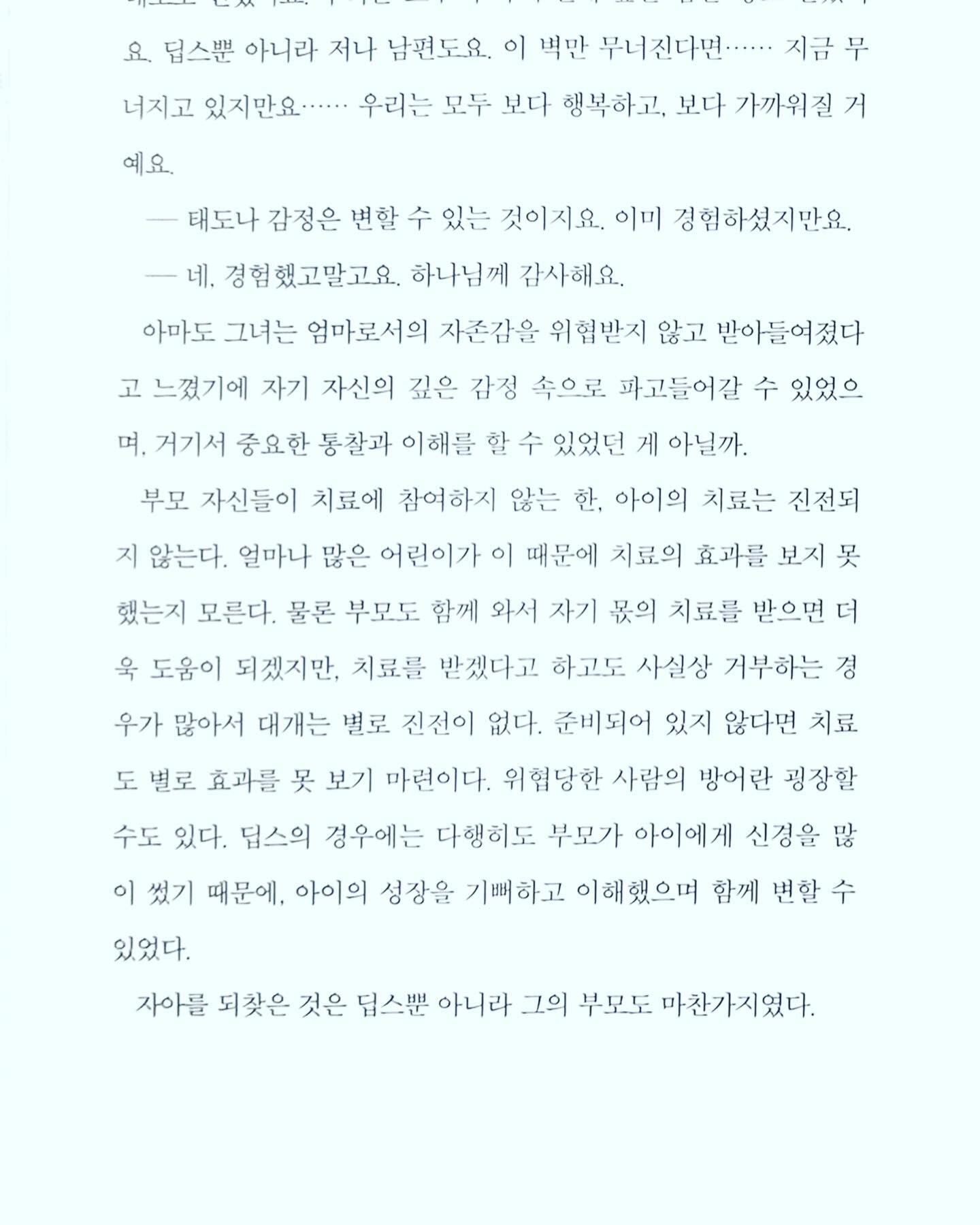 물론 이런 아름다운 이야기만 존재하는 것은 아니다. 아이가 성장이 멈추고, 다시 원래 상태로 돌아가는 듯한 모습도 보이기도 한다. 그러나 박사님은 아이를 나무라거나 자기의 방향으로 이끌려고 하는 모습이 아니라 아이의 고유한 모습을 존중해주는 것이 보인다. 기다려주는 것. 그것으로 박사님은 아이의 고유한 모습을 형성할 수 있도록 해준다. 이것이 바로 아이를 성장시키는 비결이자 아이가 세상 밖으로 나오게 하는 비결이었다.