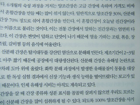 염산으로 분해하여 간장을 만들다니..이런 간장이 몸에 절대 해롭지 않을까? 걱정이 앞선다. 내 집에 있는 간장들을 유심히 살펴봐야겠다는 생각이 든다. 산분해간장인지 100% 양조간장인지 꼼꼼이 챙겨보자.