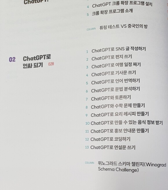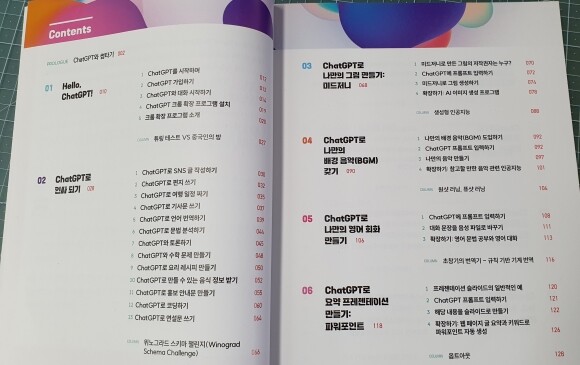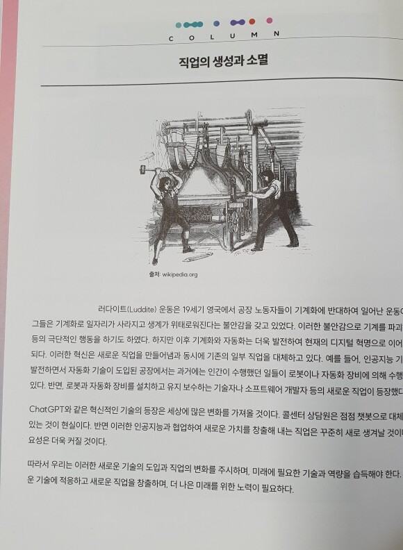 각 챕터의 끝부분마다 칼럼이 있습니다. 다양한 내용으로 읽는 재미를 주었는데, 제가 마음에 들었던 내용은 HTML에 관련된 내용과 직업의 생성과 소멸에 관련된 러다이트 운동이었습니다. 어릴 적 HTML을 붙잡고 뭔가 해보려고 했던 기억이 나기도 했고, 그렇게 붙잡고 몇 시간이고 씨름했던 것들을 챗GPT는 몇 초만에 끝을 내어버리지요. 그리고 직업 생성과 소멸. 지금 챗GPT가 나옴으로 인해 얼마나 많은 직업이 사라지고, 또 등장하게 될지 감조차 잡히지 않습니다. 챗GPT의 등장이 우리 삶에 영향을 미치는 것들이 여러 칼럼에 나타나 있습니다. 읽어 보면 재미있기도 하면서 한편으로는 섬칫하기도 합니다. 내가 가진 직업은 괜찮은 걸까? 챗GPT가 송두리째 나의 삶을 바꾸는 것이 아닐까? 하는 생각에 잠기게 만들기도 합니다. 기술의 발전에 나를 맞춰 가야 된다...라는 생각은 사실 그렇게 행복하지만은 않았습니다.