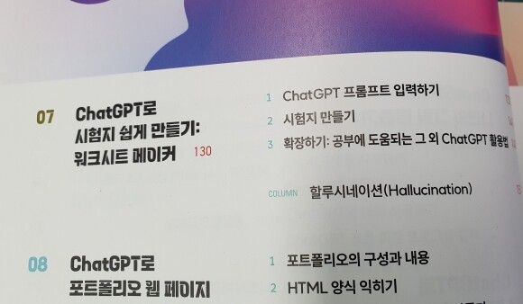 챕터7은 제 업무와도 관련된 부분이 많아 주의깊게 읽었습니다. 시험지를 만들어서 배포할 수 있는 내용인데, 수준에 맞게 만드는 것도 가능하기에 문제 자체의 오류만 제대로 검증한다면, 문제 창작의 고통을 더 이상 느끼지 않아도 될 것 같더라구요. 같이 있던 할루시네이션 칼럼도 읽어 보시면 상당히 재미있을 내용입니다. 챗GPT가 할 수 있는 것들이 얼마나 무궁무진한지 느끼게 하는 부분이었습니다.