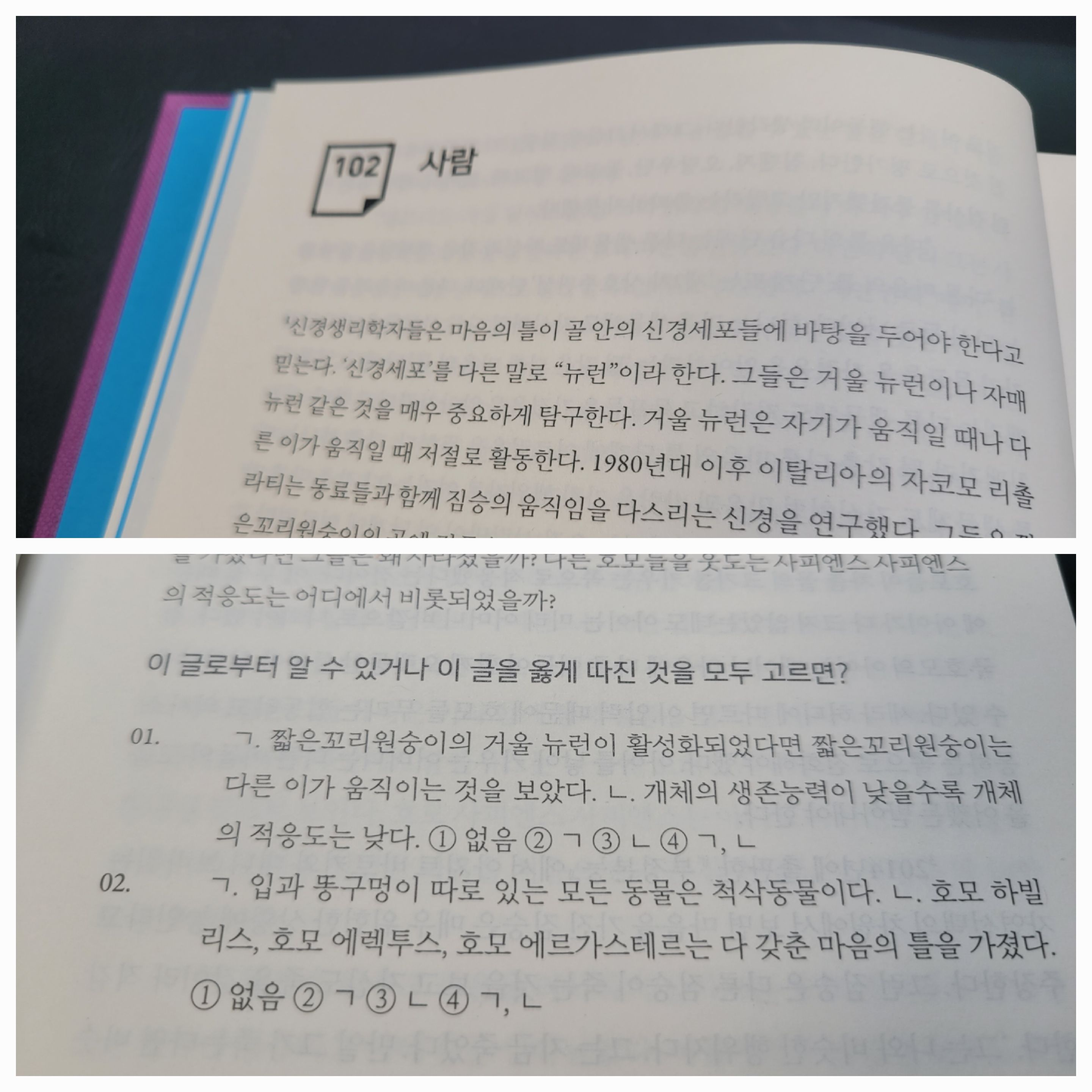 102번 지문은 사람인데요, 사람에 관련된 글을 쭉 읽고 나면 글을 잘 읽었는지 확인하는 문제가 두 문제 나옵니다. 정답은 바로 확인하면 재미없을까봐 그런지 102번 지문의 답은 103번에 있습니다. 이런 거에도 세심한 배려를 하신 저자의 노력이 엿보이는 부분이네요. 답만 확인하는 걸로 끝난다면 두뇌보완의 책이라고 보기에는 힘들겠지요? 책의 마지막 부분에 자세한 해설이 있으니 왜 답인지 모르겠다면, 꼭 정독하시는 게 좋을 것 같네요.