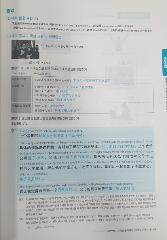 유형별 공략부분이 정말 좋았습니다. 모범답변을 한 번 쭉 읽어보면서 공부해도 좋을 것 같고, 자신이 답을 먼저 만들어서 풀어보고 모범답변을 보고 피드백을 하는 것도 좋을 것 같아요. 모범답변은 QR코드로 연결하여 음성으로 들을 수도 있습니다. 정말 독학으로 하기에 쉬운 해커스 HSKK 중급 10일 책이네요.