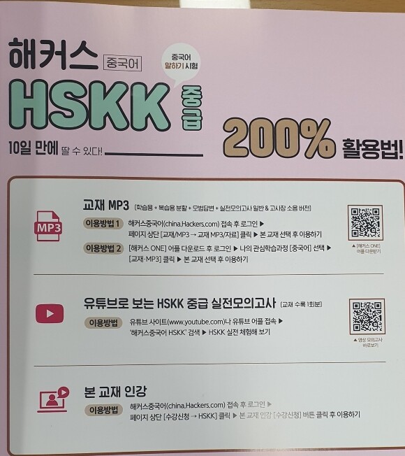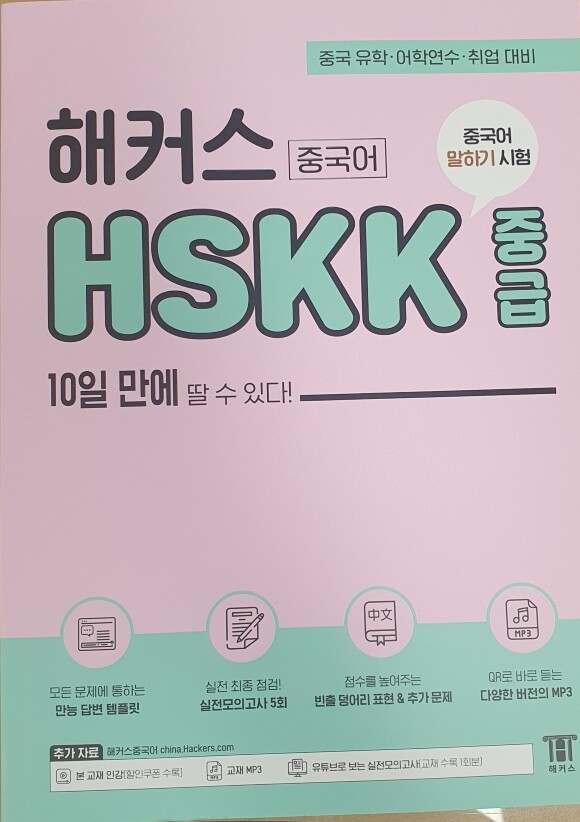 중국어를 모르는 분들이 10일만에 HSKK 중급을 따는 것은 당연히 힘든 일입니다. 하지만 어느 정도 중국어를 배우신 분들이라면 중급 응시하는 것이 무척이나 어려운 일은 아닐텐데요. HSKK중급을 빠르고 효율적으로 합격하기 위해서 교재가 필요하신 분이라면, 해커스에서 만든 이 책으로 공부하시면 좋을 것 같습니다.