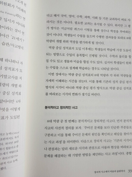 '점수가 아니라 역량이다'는 점수로 서열이 매겨지는 것이 아니라 비판적 사고, 사회적 기술, 인지적 능력으로 복합 문제를 해결할 수 있는 역량을 중시하는 내용이에요.
