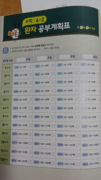 완자 공부계획표는 12주차 48회로 구성되어 있어요.