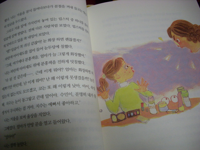 가겠죠. 우리 작은 아이.. 아직 초등학교도 안 들어갔는데 화장하고 싶어서 얼굴에 로션을 듬뿐 듬뿍 바르고 립스틱으로