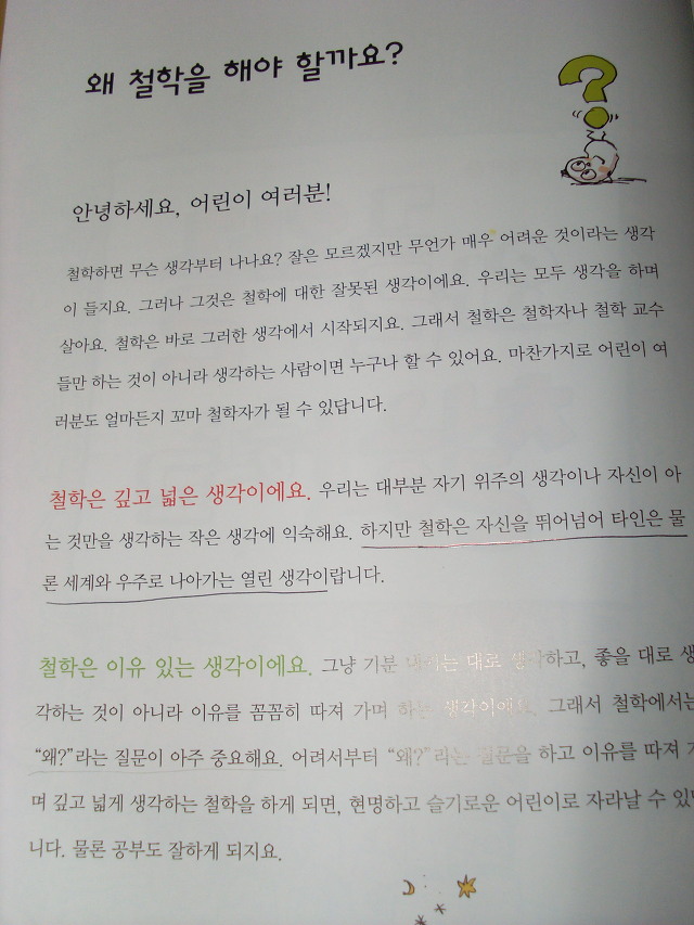 다는 거죠. 이 책 와글와글 철학학교는 이 왜? 라는 질문을 다각도로 생각할 수 있게 질문을 하고 그에 대한 대답을