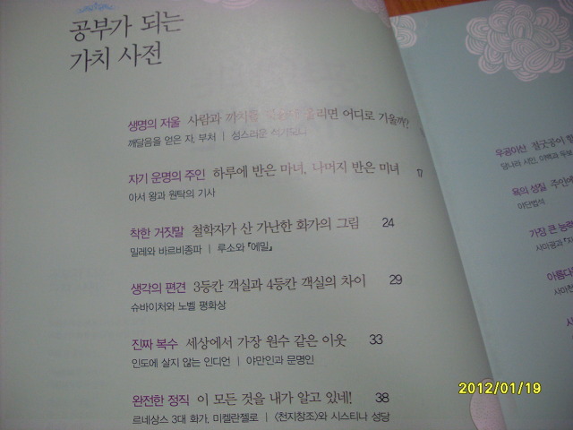 하고 보이지 않는 힘을 새로이 알게 된 듯한 기쁨이 생기더군요. 앞장에 쓰여진 대로 미국의 최고 대학을 나온 능력 있고 똑독한 엘리트들이 그들의 능력과 재능을 자신과 사회를 위한 좋은 곳에 쓰지 않고 잘못된 판단으로 삶을 망치고 주변에 엄청난 손실을 입히는 것은 능력만큼이나 옳고 그름을 판단할 수 있는 것이 가치라는 것을 다시 한 번 일깨워 주는 것이므로 반드시 어린 시절부터 이러한 분별력을 키워야 하겠죠. 부모인 제 입장에서도 우리 어린 자녀들에게 무엇을 후에 정신적 유산으로 남길 것인가에 관하여 혼자 고민해 보기도 하는데 그래서 이런 가치 사전 책에 더 마음이 가는것 같네요.