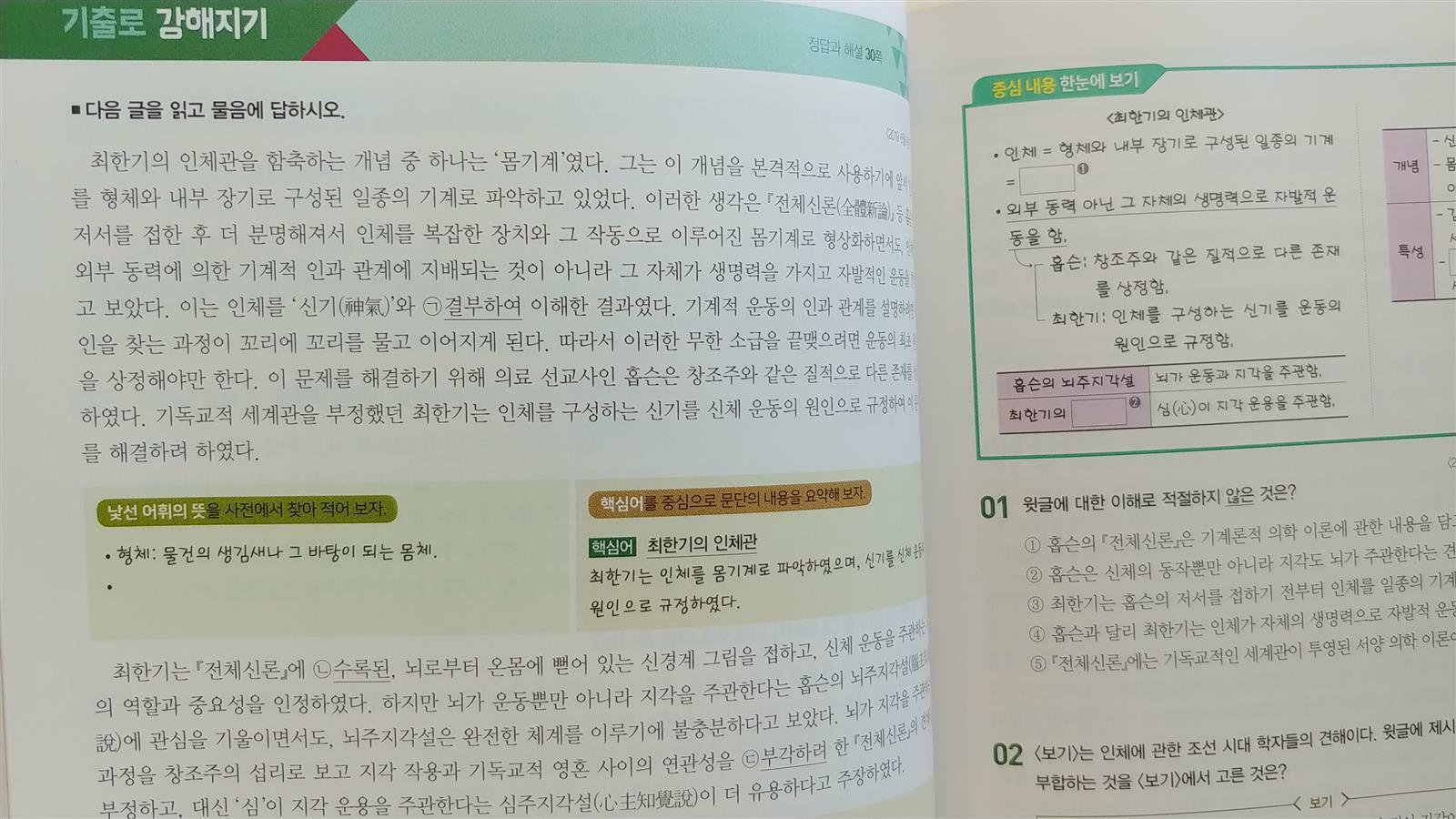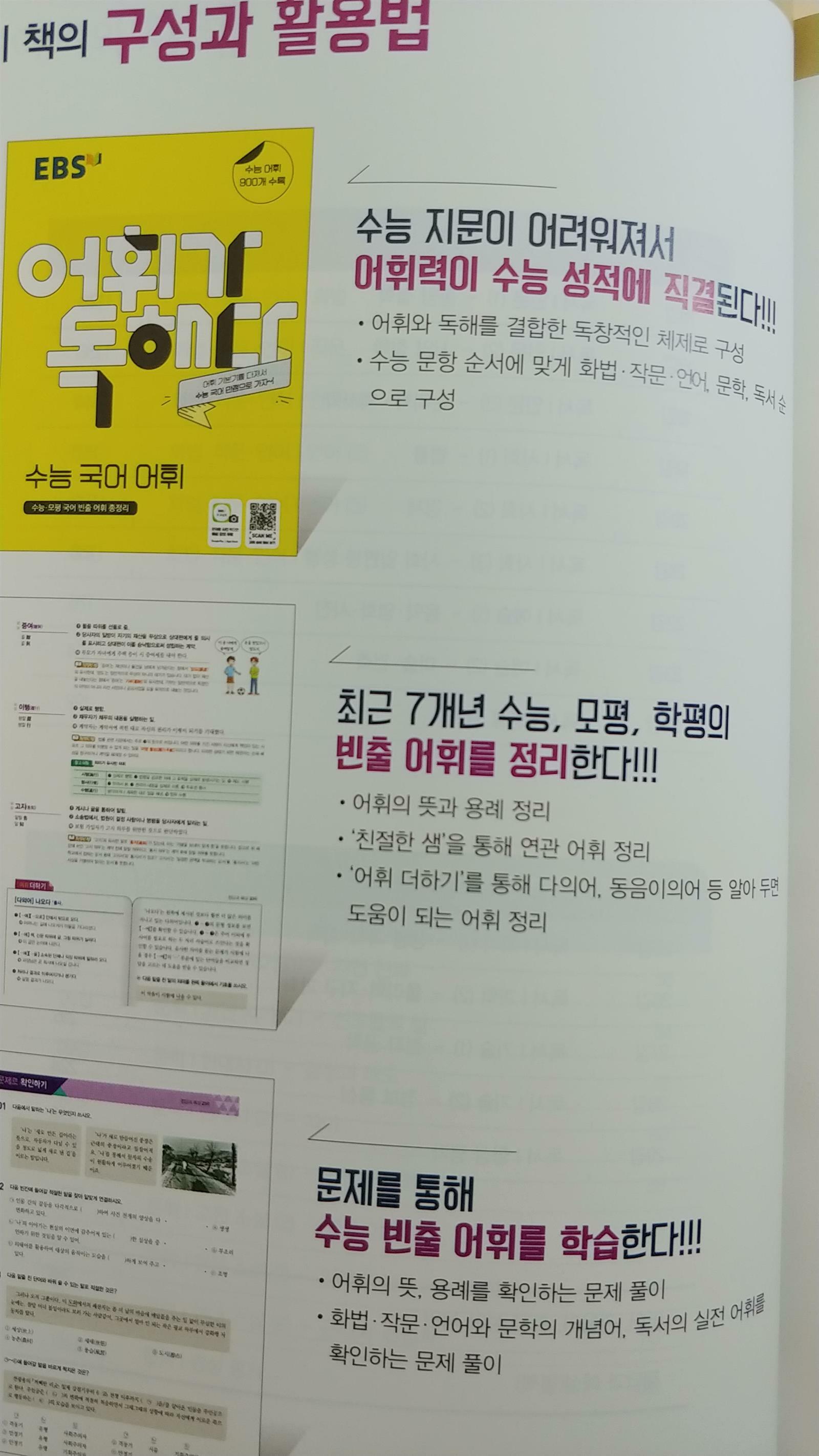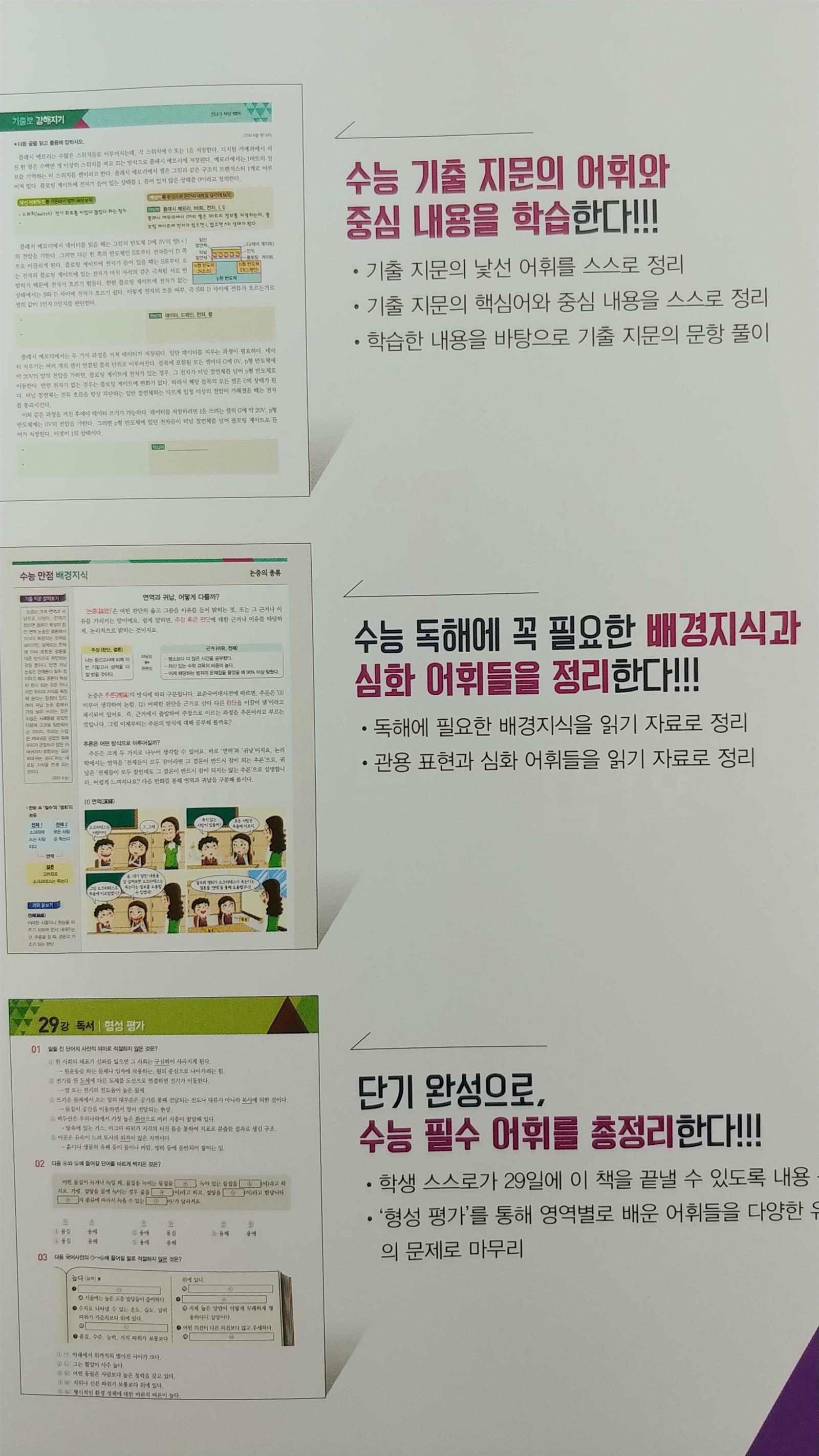 수능 국어 파트별로 구성되어 있습니다. 최근 7개년 수능.모평. 학평의 빈출 어휘가 정리되어 있습니다. 그림도 적절히 들어있고 설명이 자세히 되어 있어 공부하기 어렵지 않습니다. 또한 공부한 어휘를 문제를 풀며 습득여부를 확인할 수 있어 좋습니다. 수능 기출 지문의 낯선 어휘와 핵심어를 정리하고 수능 독해에 필요한 배경지식과 심화 어휘들도 공부할 수 이시습니다. 29일 완성으로 구성되어 있으며 영역별로 어휘를 공부하고 다양한 문제로 마무리 할 수 있습니다.