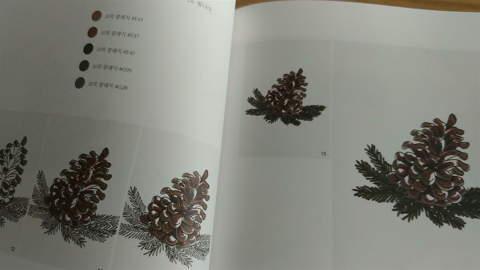 그리는 순서가 단계별로 자세히 나와있어서 펜하나로 쓱 드로잉하고 원하는 재료로 채색을 하면 됩니다.