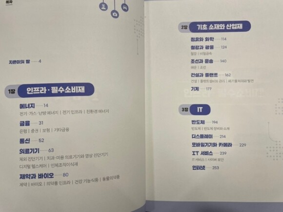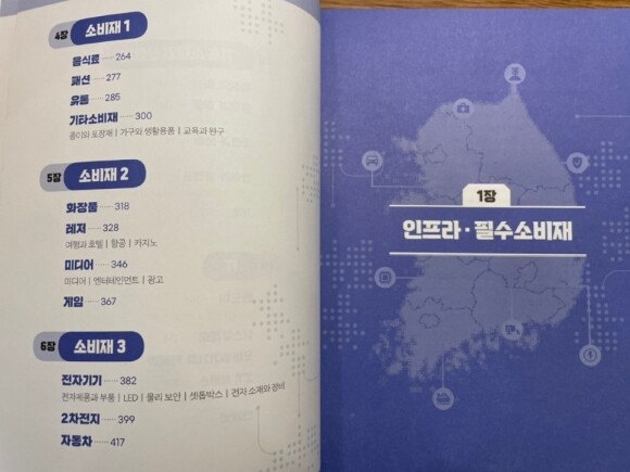 책은 생각보다 크고 두껍지만 그렇다고 어려운책이 아니라서 투자를 고민할때마다 관련 섹터를 열어 공부를 하면 정말 유익한 책이 될것이라고 본다. 역시나 내가 가장 관심있는 반도체, 2차전치를 중점적으로 읽었고 그 외에도 배장관련주식에 관심이 많이 그런 부분들이 도움이 많이 되었다. 무엇보다 업종병, 섹터별 명확하게 분류되어있고 또 시총 상위기업들을 소개해주면서 관련 업종안에서 관심을 가질만한 기업들을 소개해주니 초보 투자자들은 어떤 업종이 있는지, 어떤 섹터가 있는지, 해당 섹터에서 어떤걸 중점적으로 보고 흐름을 읽는지등에 대해 자세하게 알수있도록 일목요연하게 정리가 되어 있어서 큰 흐름을 파악하는데 도움이 많이 될것같다. 이런 관련 책을 몇권을 읽었는데 큼직큼직한 글씨가 시원시원하여 그것도 매우 만족함.