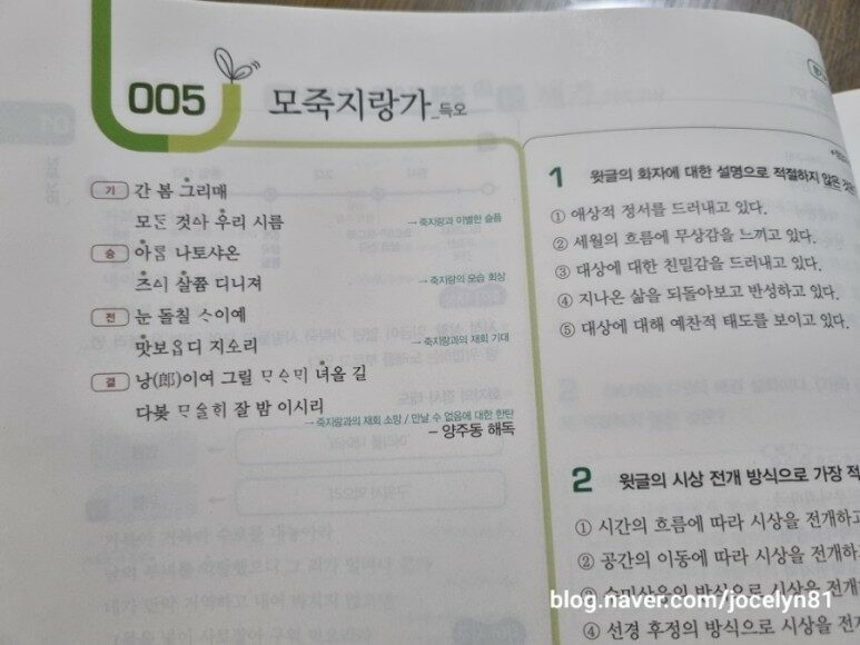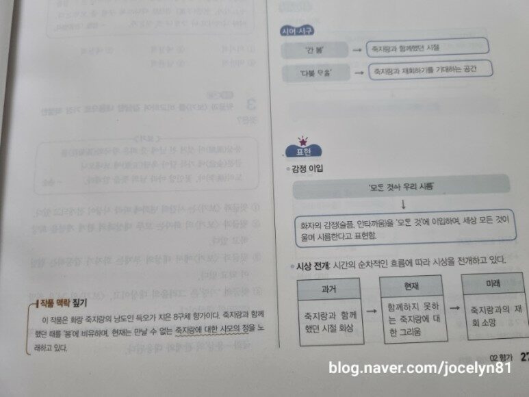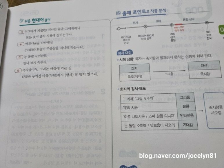 출제포인트가 나와 있어서 작품 창작 시기가 연표로 제시되어 있고, 화자, 대상, 시어시구, 표현의 주요 요소에 따라 작품이 체계적으로 분석되어 있어요. 배경지식 plus가 있어 다양한 배경지식도 함께 익힐 수 있구요.