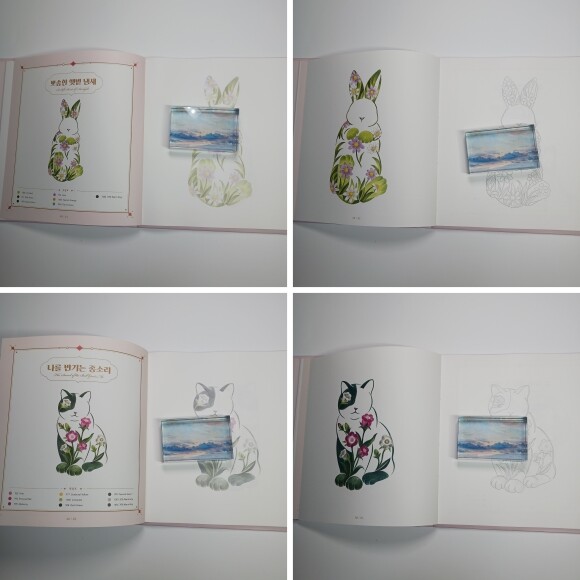 복잡한 도안의 컬러링이 부담스러우셨던 분들이라면.... 동물을 좋아하시는 분들이나 꽃을 좋아하시는 분들이라면 소소한 취미생활을 시작하시고 싶으셨던 분들에게 이 책을 추천 드립니다.