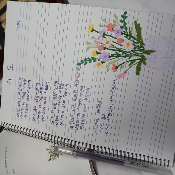 수채 색연필이라 물만 묻혔습니다. 망했습니다. 그래서 수채 물감으로 아래쪽 꽃에 연하게 더 물감을 넣어 색칠하였더니 색이 심하게 울어요~~