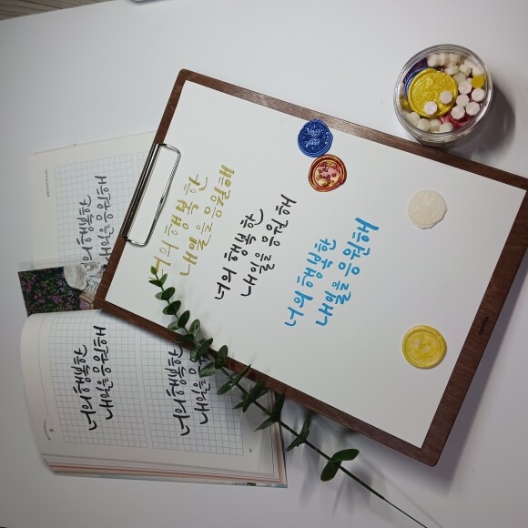 전공자가 아니였지만 꾸준히 캘리를 쓰면서 실력이 늘었고 예술성만 강조된 캘리그라피가 아닌 감성이 담겨 있고 개성이 묻어나는 서체를 표현하고 싶어서 열심히 연습하셨다고 합니다. 글씨와 그림을 선물할때 받는 사람들이 행복해 하는 표정을 보는 순간 얼마나 행복한지 그들은 모를거에요. 작가님도 행복하셨고 더 쉽게 접할수 있는 게 무엇이 있을까 고민을 하시면서 캘리 소품들을 만들기 시작하셨다고 하네요.