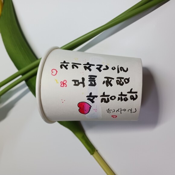 무지 컵이 없어서 그나마 인쇄가 적은 면에 포스캄물감으로 지운 후에 위에다가 글씨를 써보았습니다.