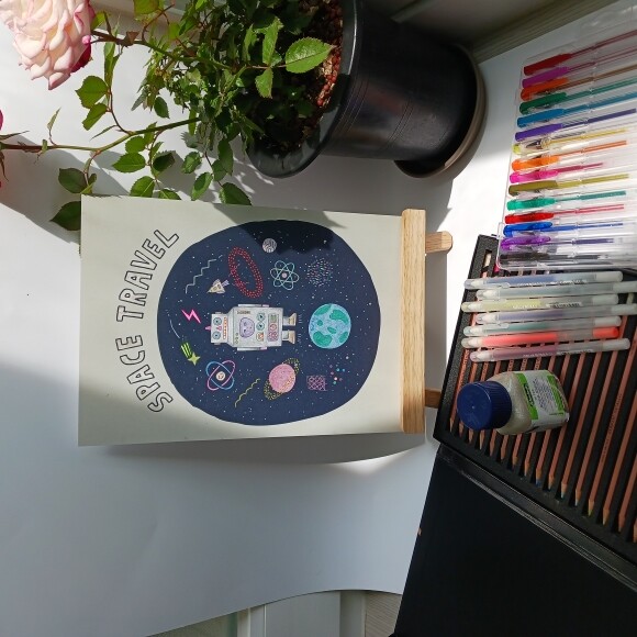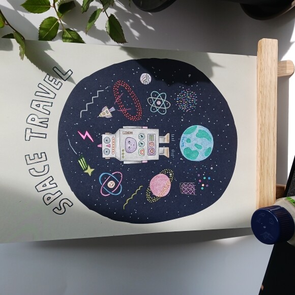step.2 나만의 우주 도안은 우주의 별들을 반짝이로 하고 싶어서 반짝이 색연필과 젤펜과 쉬민케 아쿠아 샤인 반짝이를 사용하였습니다.