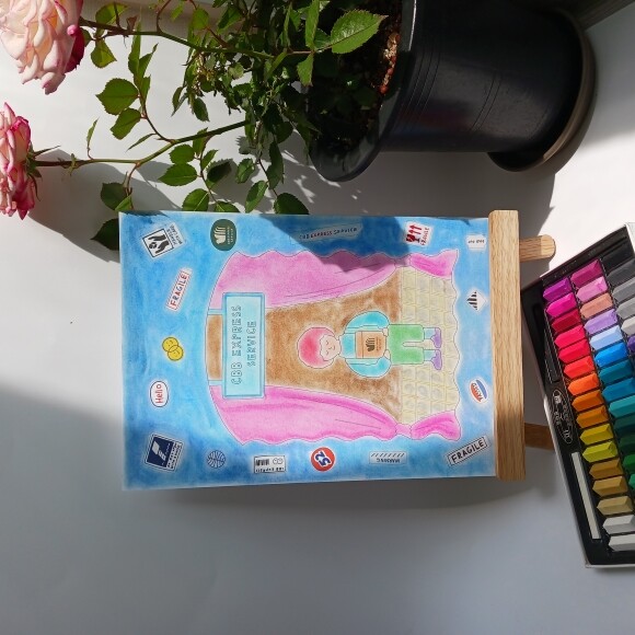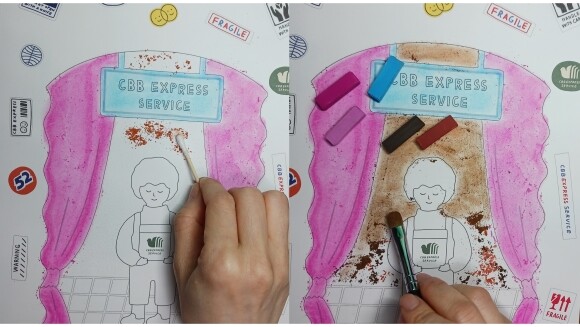 step.3 배경까지 다 칠해야 하는 3단계의 특급 배달 서비스는 소프트 파스텔을 칼로 갈아서 붓이랑 면봉 손가락으로 문질렀어요.