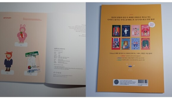 마지막 뒷장에는 이렇게 귀여운 예쁘게 색칠해서 종이 피규어로 사용 할수 있는 페이지도 있답니다. 책의 뒷장도 알록달록 깔끔한 도안들이 있어요.