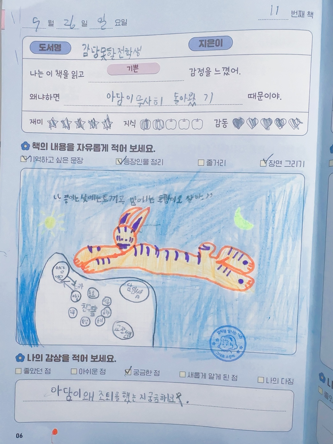 책을 읽고 독후활동을 하겠다면서 혼자서 열심히 뭔가 그리고 쓰더니이렇게 작성해 주었네요 .재미도 있고 감동도 많이 받았느데요.. 지식을 많이 배우지 못했다네요 ..