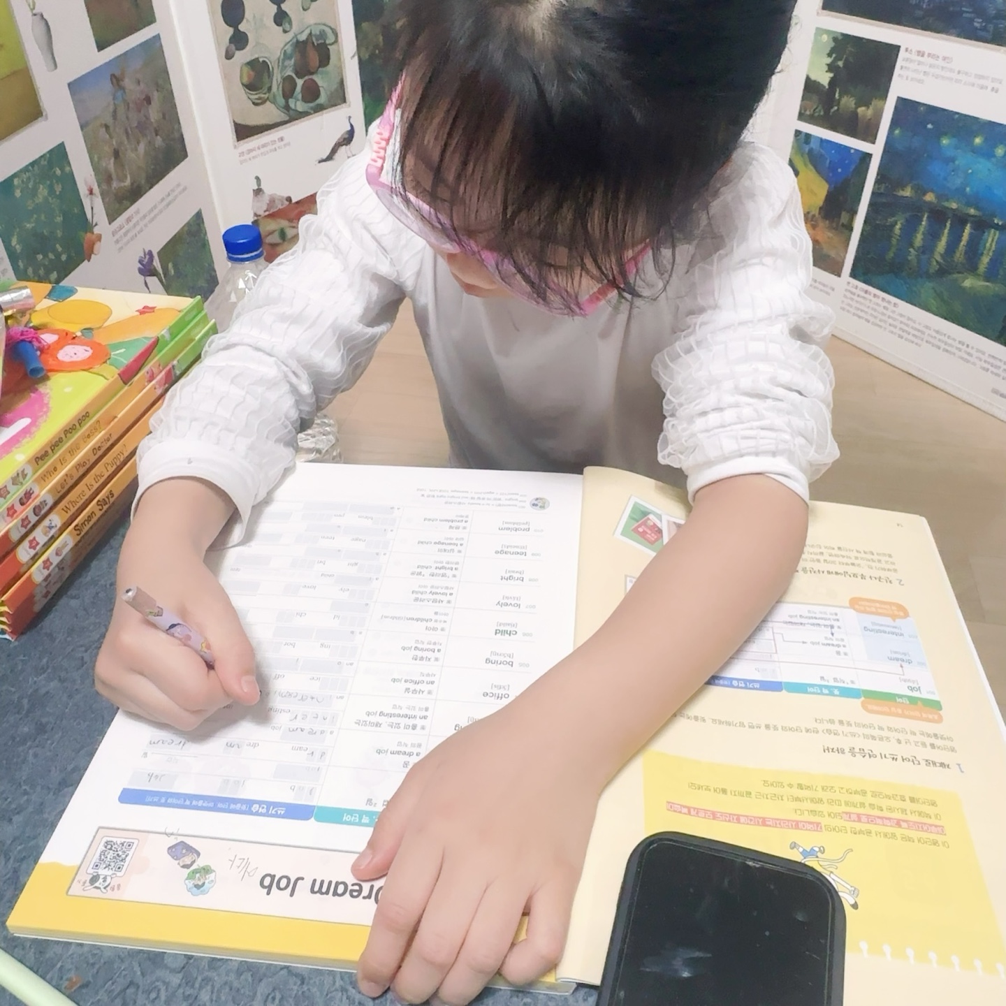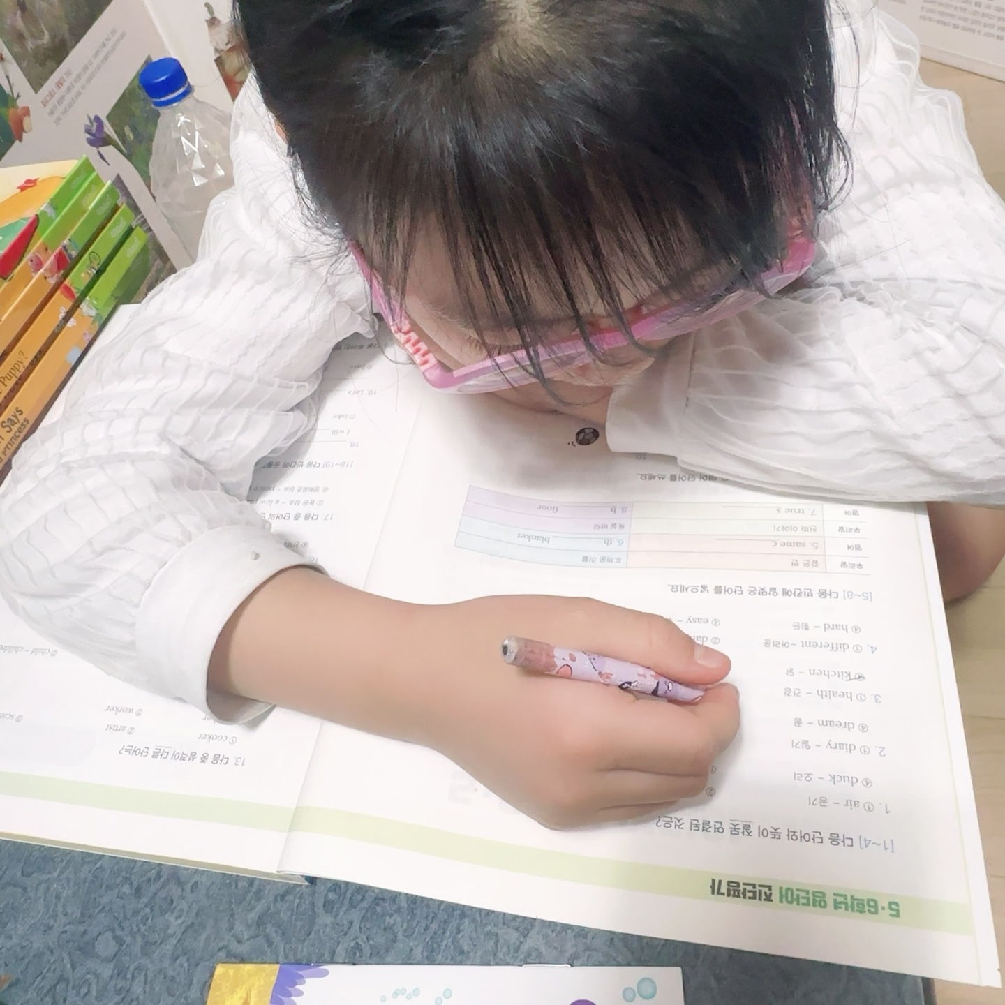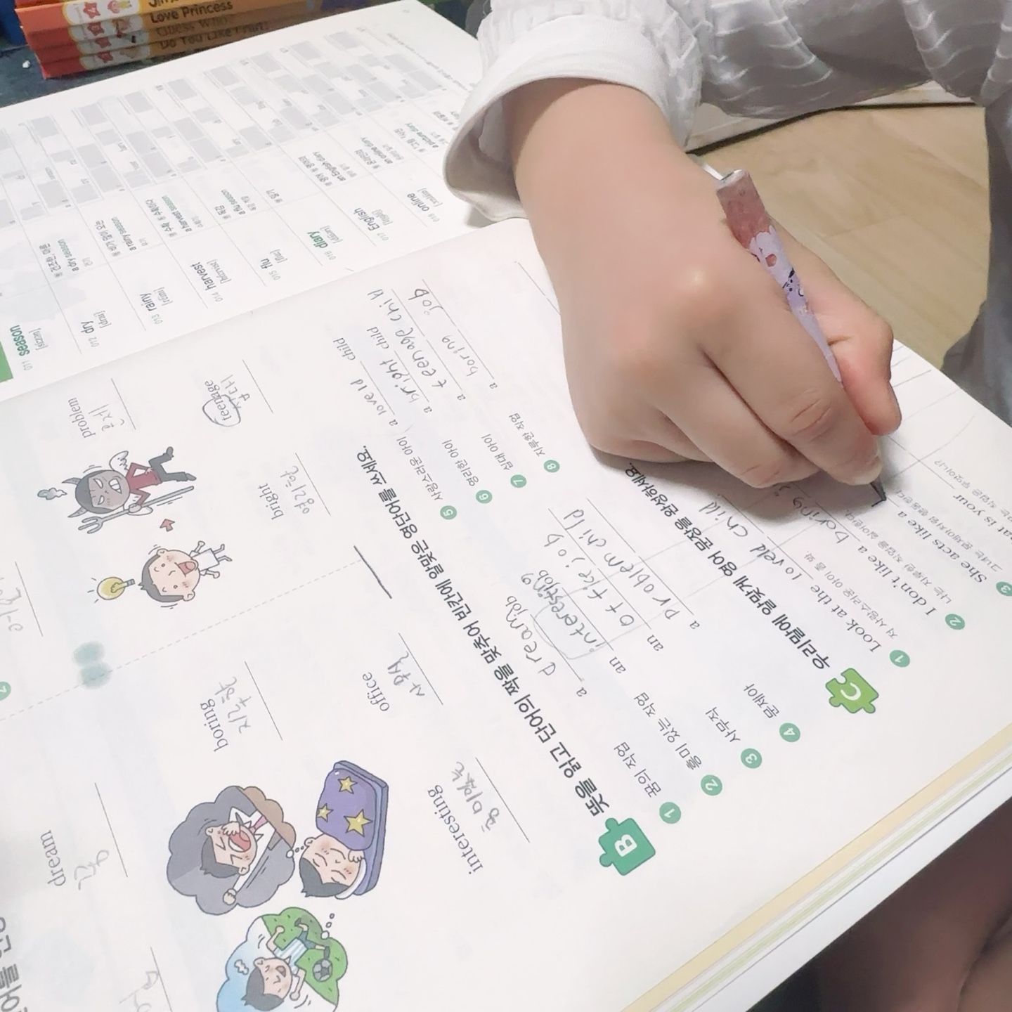 3-4권 보다 단어 난이도가 높아진 만큼 더 열심히 하나씩 따라 쓰고 있어요 .