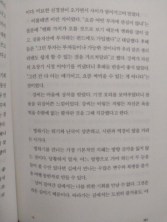 이 문장이 책의 주제를 설명하고 있어요. 절벽에 매달리기보다 과감히 바닥을 치고 솟구치는 힘을 추구하라는 거예요. 가만히 생각하니 그 말이 맞네요. 이제는 정말 바닥이라는 절망에서 더 이상 잃을 것이 없을 때 불사조처럼 살아나 성공한 사람들이 있었어요.