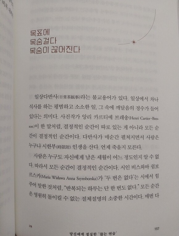 불교에선 여유와 비움의 지혜를 찾아볼 수 있는데 일상다반사라는 용어도 불교에서 왔어요. 일상에서 차나 식사를 하는 평범하고 소소한 일에 깨달음의 정수가 들어 있다는 의미예요. 결정적인 순간이 따로 있는 게 아니라 모든 순간이 결정적인 순간입니다. p.157
