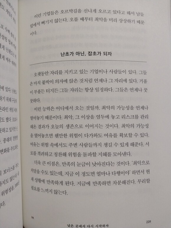 사람도 난초보다 잡초가 되어야 살아남을 수 있어요. 2할이 겉모습이면 8할이 뿌리인 잡초처럼 주어진 상황을 인정하고 생존할 방법을 모색해야 한다고 해요.p.237