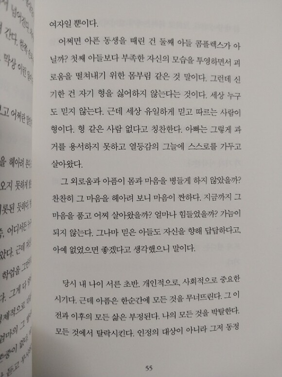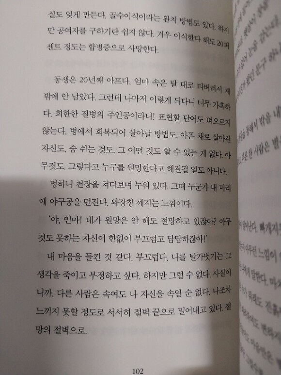 동생은 20년째 아프고 지은이는 마치 머리에 누군가 야구공을 던진 것 같았다고 해요. 이 상황이 되면 누구라도 절망의 끝으로 몰리는 심정을 느낄 수 밖에 없어요. p. 102