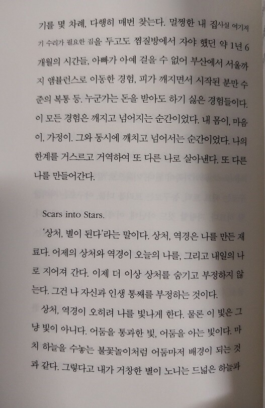 종교 지도자나 성자라 해도 이런 고난을 이겨내기는 어려울거라는 생각이 듭니다. 그럼에도 지은이는 상처, 역경이 오히려 나를 빛나게 한다는 믿음을 갖고 있어요. 어둠을 통과한 빛, 어둠을 아는 빛. 자그마한 방을 비추는 촛불 하나, 시린 손을 데워 주는 손난로 같은 존재만 되어도 감사하다고 말합니다.p.147