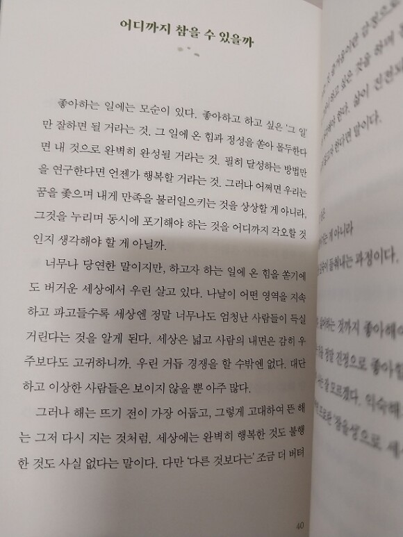 사랑, 이별을 비롯해 감정적인 문제를 다루는 내용이 많아요. 시와 에세이 형식을 통해 흐트러진 생각과 마음을 모았어요. 철학적인 느낌이 들 정도로 생각에 잠기게하는 문장이 곳곳에 있어요. 책의 표지도 예쁘고 깔끔한 구성도 좋아요. 천천히 읽으니 전시회를 감상하는 기분이 들기도 하네요. 굴곡있는 길을 지나온 것처럼 느껴지고 공감을 갖게 해요. 멀리 볼 것이 아니라 매일매일을 버티며 작은 기쁨이라도 모아야겠어요. 만기 적금을 찾듯이 가까스로라도 행복을 찾을 수 있다면 해피엔딩이니까요.