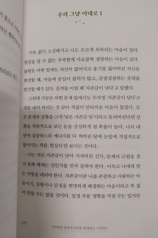 이유없이 소심해지고 위축되는 마음, 원인을 알 수 없는 부족함에 절망하는 마음, 자신이 없어지고 용기를 잃어버리는 건 자존감이 낮기 때문이에요. 모든 상황을 그저 낮은 자존감 탓으로 돌리면 상황을 객관적으로 보는 눈을 상실할 확률이 높다고 해요.p.179