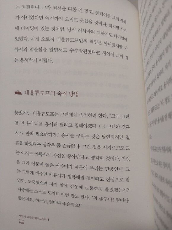 톨스토이의 소설 '부활'의 주인공 네흘류도프는 혈실감 넘치는 답답이예요. 아름다운 하녀 카튜샤가 남자들에게 시달리다 사창가로 들어갔습니다. 그녀의 인생을 망치는데 일조한 네흘류도프는 속죄한답시고 그녀와 결혼하겠다는 결심을 해요. 귀족인 자신이 자선을 베푸는 기분에 도취된 그에게 카튜샤는 뭔 속죄냐 돈이나 달라 같은 반응을 보입니다. 심각한 내용일텐데 왜 이렇게 코믹한지. p.48