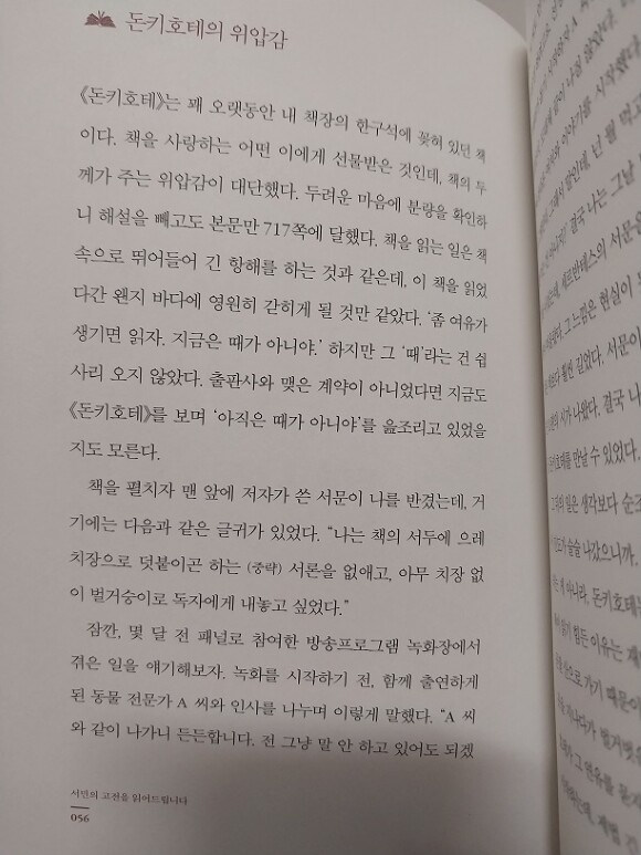 '돈키호테'의 원본이 거의 백과사전급 두께에 서문이 길고 11편의 시가 나온 뒤에야 돈키호테가 나온답니다. 이야기가 곧잘 산으로 가서 읽기 힘들다니 이제까지 주요 이야기만 추려놓은 책을 읽은 것이 다행이라는 생각마저 들어요. 우리나라에서 '돈키호테'원본을 읽은 사람이 거의 없으니 과시욕이 있는 사람은 타이틀을 노려볼만 하네요.p. 57