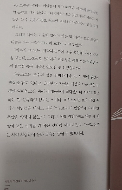 글쓴이가 찾은 파우스트의 교훈은 직접 경험하지도 않은 채 세상의 모든 이치를 다 아는 것처럼 나대지 말라가 되네요.p.90