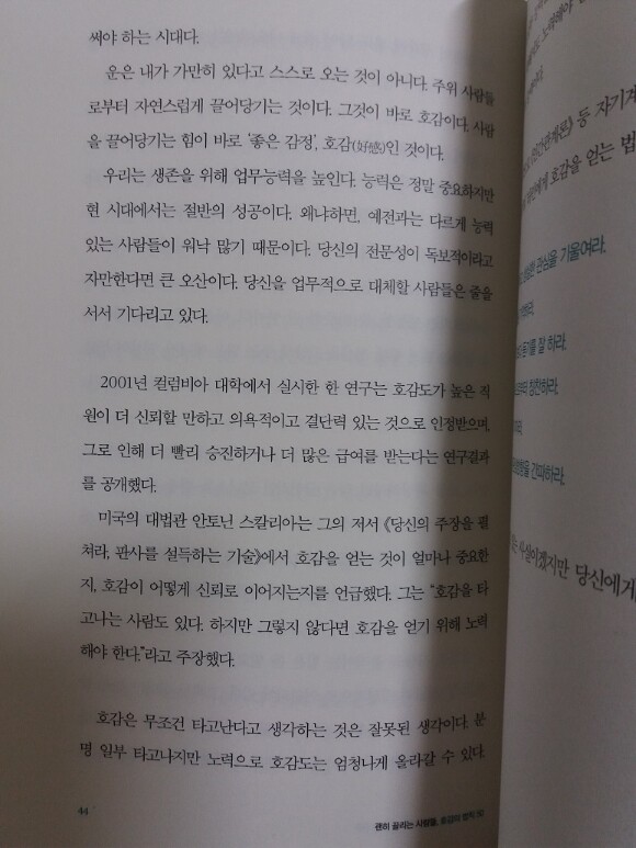 운은 가만히 있는다고 스스로 오지 않아요. 주위 사람들로부터 자연스럽게 끌어 당기는 거예요. 사람을 끌어당기는 힘이 바로 호감입니다. 호감도가 높은 직원이 더 신뢰할 만하고 의욕적이고 결단력 있는 것으로 인정받아 더 빨리 승진하거나 많은 급여를 받습니다. p. 44