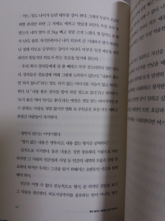 강사가 외모로 승부하는 건 아니지만 외모가 주는 호감을 무시할 수 없습니다. 저자는 회사 강사들에게 자기 관리의 중요성을 강조합니다. 내용 좋은 강사는 발에 차일 정도로 많고 연기 잘하는 사람은 많지만 영화 속 주인공은 호감 가고 예쁘다는 의미지요.