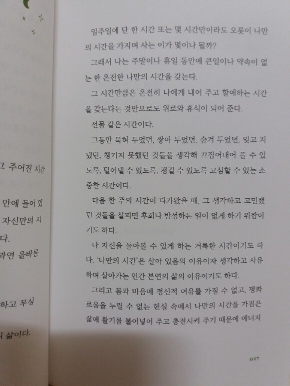 일주일에 단 한 시간 또는 몇 시간만이라도 오롯이 나만의 시간을 가지라고 합니다. 주말이나 휴일 동안에 큰일이나 약속이 없다면 자신을 위한 시간을 내어 주고 지난 주를 되돌아보고 다음 한 주에 대해 생각하도록 해요. 몸과 마음에 정신적 여유를 가져야 인간 본연의 삶을 누릴 수 있답니다. p. 27