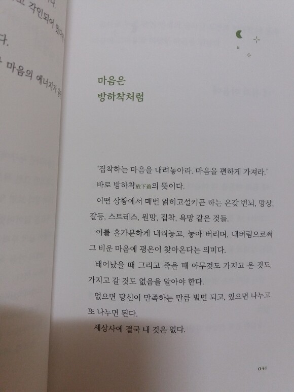 태어났을 때 죽을 때 아무것도 가지고 온 것도 가지고 갈 것도 없음을 알아야 하고요. 세상사에 결국 내 것은 없으니까요. p.41