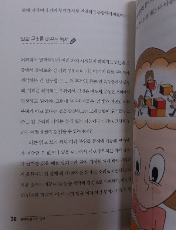 뇌의 여러 부위를 활성화해서 가장 많이 변화시킬 수 있는 활동은 바로 글을 읽고 쓰는 거라고 해요.  뇌는 읽고 쓰기 위해 여러 부위를 동시에 가동해요. 글자를 본다- 소리로 바꾼다- 소리를 뜻으로 바꾼다- 뜻을 생각과 감정으로 이해한다는 네 단계를 거치면서 뇌의 여러 부위가 활발해져요.