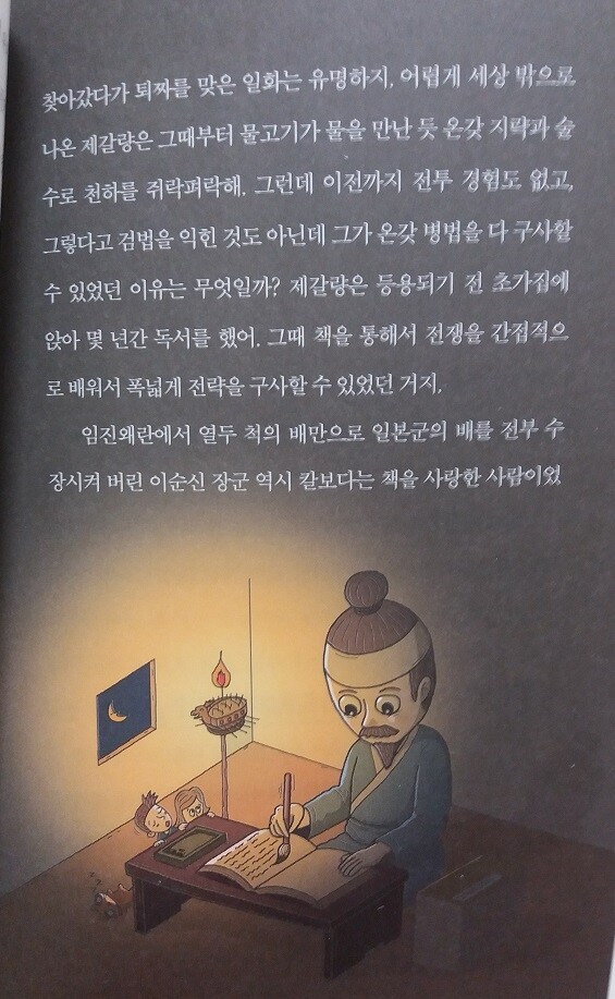 삼국지에 나오는 천재 제갈량은 집에서 몇 년간 독서만 했던 사람이에요. 책을 통해 전쟁을 간접적으로 배워 폭넓은 전략을 구사할 수 있었답니다. 이순신 장군도 칼보다 책을 사랑한 사람이어서 학익진과 같은 전술로 일본군을 이길 수 있었구요.