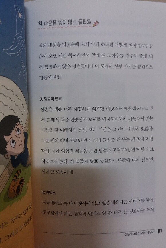 책 내용을 오래 기억하려면 몇 가지 꿀팁이 필요해요. 책을 깨끗이 읽으면 머릿속도 깨끗해진다는 생각으로 밑줄, 별표, 물결무늬 등을 해서 나중에 읽을 때 도움이 되게해요. 나중에 다시 읽고 싶은 내용에는 인덱스를 붙여요. p. 61