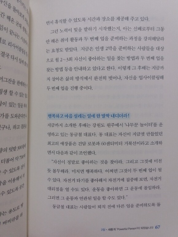 현재 강원도 원주에서 나무꾼 놀이터를 경영하는 그 후배는 자신이 정말 좋아하는 것을 찾아 미친듯 몰두하라고 합니다. 미치면 행복하고 어쩌면 그것이 두 번째 업이 될 수도 있으니까요. p. 67
