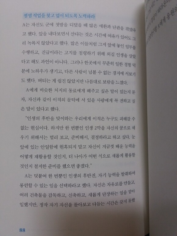 이 책에서는 50이후로는 가슴 뛰는 나만의 온리원을 찾으라고 합니다. 아는 후배는 취미로 아이스크림 막대나 이쑤시개를 이용해 건담 로봇과 거북선을 만드는 공예를 하다 방송에 소개되어 활기를 얻고 40이 넘은 나이에 새로운 일도 시작했어요. 인생 2막을 준비하는 사람을 대상으로 자신이 좋아하는 일을 찾는 방법과 두 번째 업을 찾는 방법 등을 안내하는 강의도 하구요.