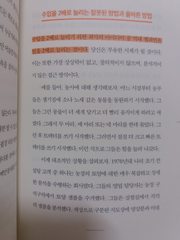 투잡을 하면 수입을 늘릴 수 있다고 생각했어요. 이 책에선 수입을 2배로 늘리는 잘못된 방법은 일을 2배로 늘리는 거라고 해요. 상상력이 없고 창의적이지 않고 분석적이지 않아 부유한 시체가 될거랍니다.p. 111